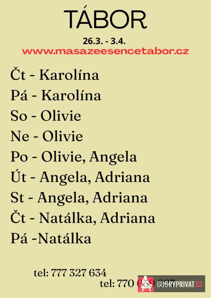 Vítám vás v salonu MASÁŽE ESENCE, www.masazeesencetabor.cz. JSEM TU PRO TEBE NOVÁ od středy do pátku 25.-27.3. Jsem smyslná dívka co vás ráda potěší. Extra: masáž prostaty, footjob, koupací rituál a DOTEK TOUHY=JÁ SE HLADÍM TY SE KOUKÁŠ Pro více informací volejte: 777327634 nebo . JEDNÁ SE O EROTICKOU MASÁŽ. Je to velice hravá a intimní masáž, do které zapojím nejen své ruce, ale i stehna, zadeček i prsa. DOPORUČUJI: délku masáže 60 min. a z důvodu hlubšího prožitku délku 90 min. www.masazeesencetabor.cz