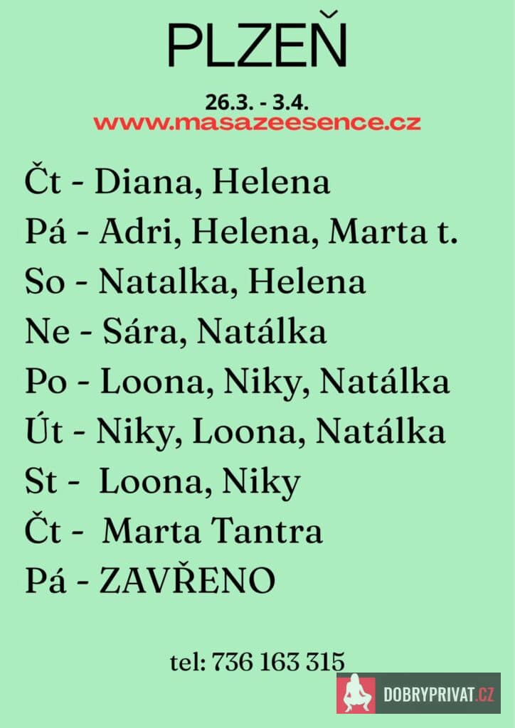 Vítám vás v salonu MASÁŽE ESENCE, www.masazeesence.cz. Jsem tu pro tebe vev pondělí a úterý 30.-31.3.   Pro více  informací volejte na tel.č. 736163315.  Jsem SMYSLNÁ dívka co vás ráda potěší. JEDNÁ SE O EROTICKOU MASÁŽ S RUČNÍM VYVRCHOLENÍM.  Je to velice hravá a intimní masáž, do které zapojím nejen své ruce, ale i stehna, zadeček i prsa.  MASÍRUJI CELÁ NAHÁ.  .DOPORUČUJI: koupací rituál, BDSM doft a další …. délku masáže 60min. a z důvodu hlubšího prožitku  90min.  Tel. 736163315    www.masazeesence.cz